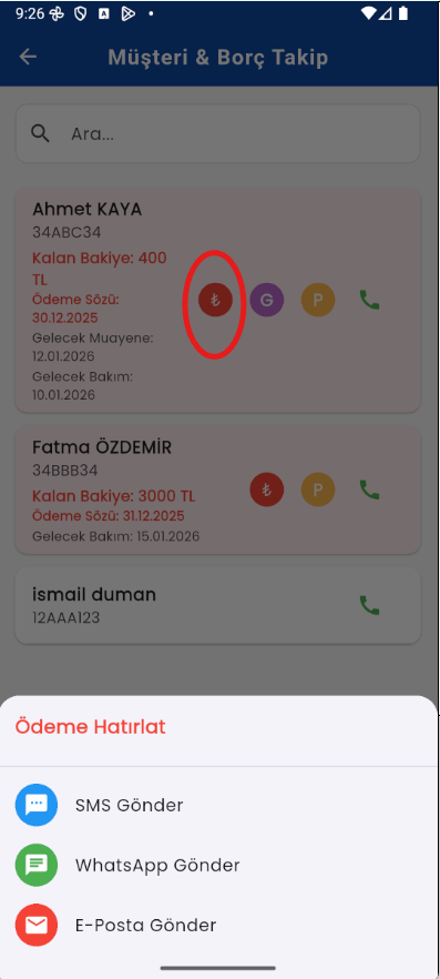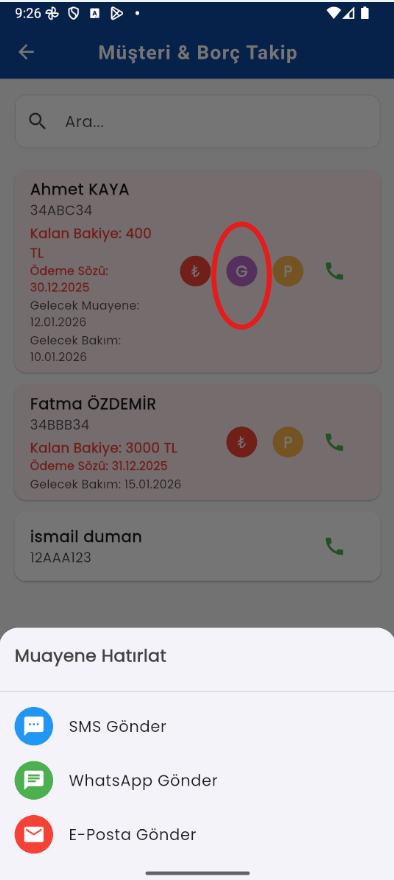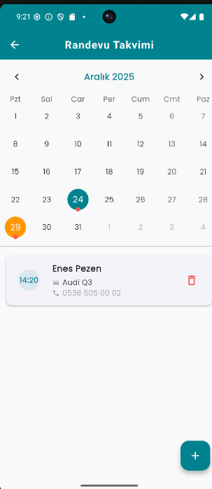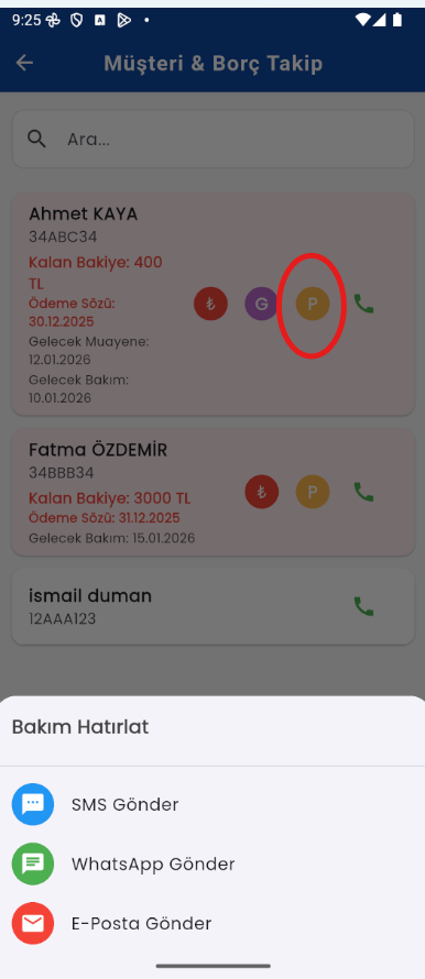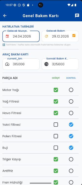 Motor yağı değiştiğinde sistem sonraki bakımı **otomatik +10.000 KM hesaplar**. Parça bazlı "Değişti / Kontrol Edildi" durumuyla müşterinizi bilgilendirin.